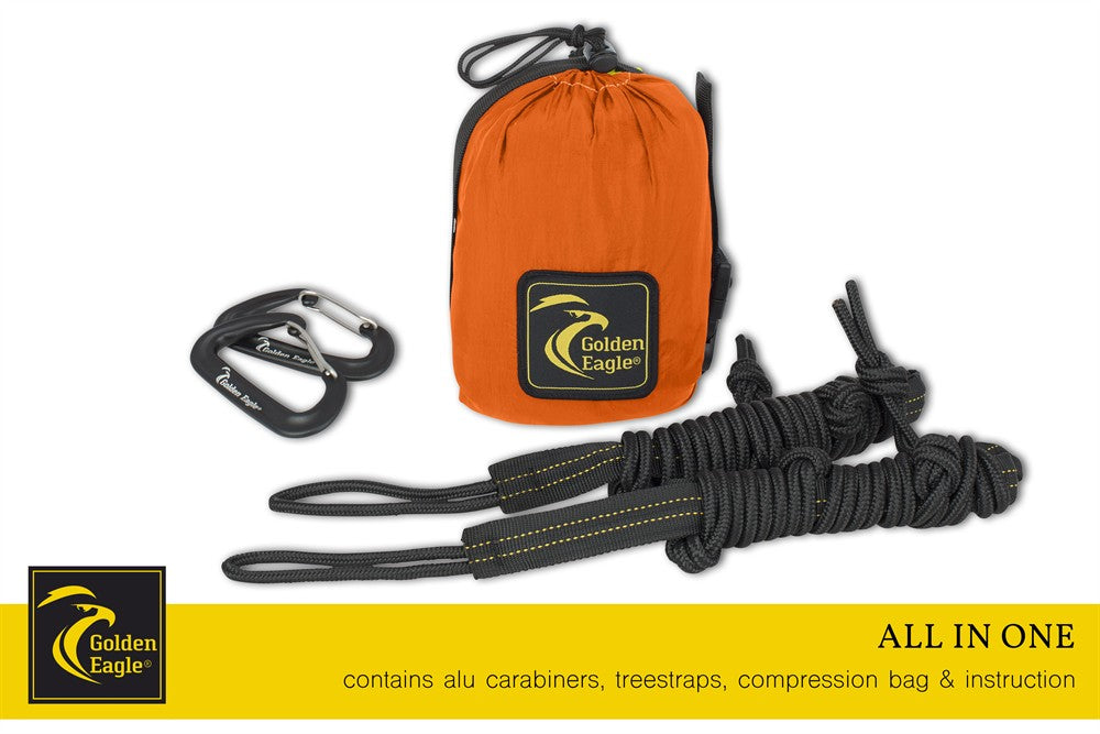 EASY AND FAST ASSEMBLY - The hammock can be easily and simply hung up within 3 minutes using the 2 aluminum carabiners and lines (2m long) supplied. Gentle on the tree. THE CONVENIENT HANGING SET WITH 23 LOOPS IS SOLD SEPARATELY.